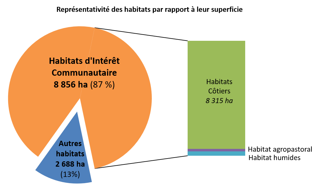 Le périmètre du site est composé à 87% d'habitats d'intérêt communautaire, ce qui illustre bien la richesse écologique du site. Les autres habitats sont pour la plupart des zones anthropiques telles que les routes, zones bâties, friches, etc.